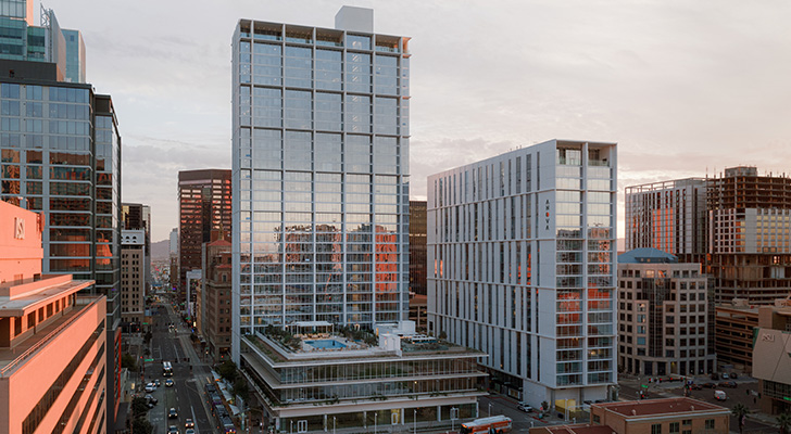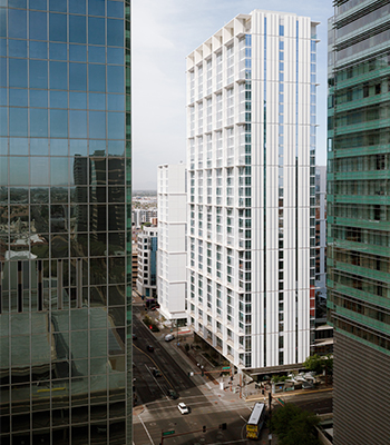 More than 30,000 SF of street-level retail and dining activate the site throughout the day, while desert-adapted landscaping, wide sidewalks, and shade-first design prioritize comfort and walkability. Climate-responsive architecture defines the project, with white façades, vertical fins, slab extensions, and self-shading panels tuned to solar orientation.