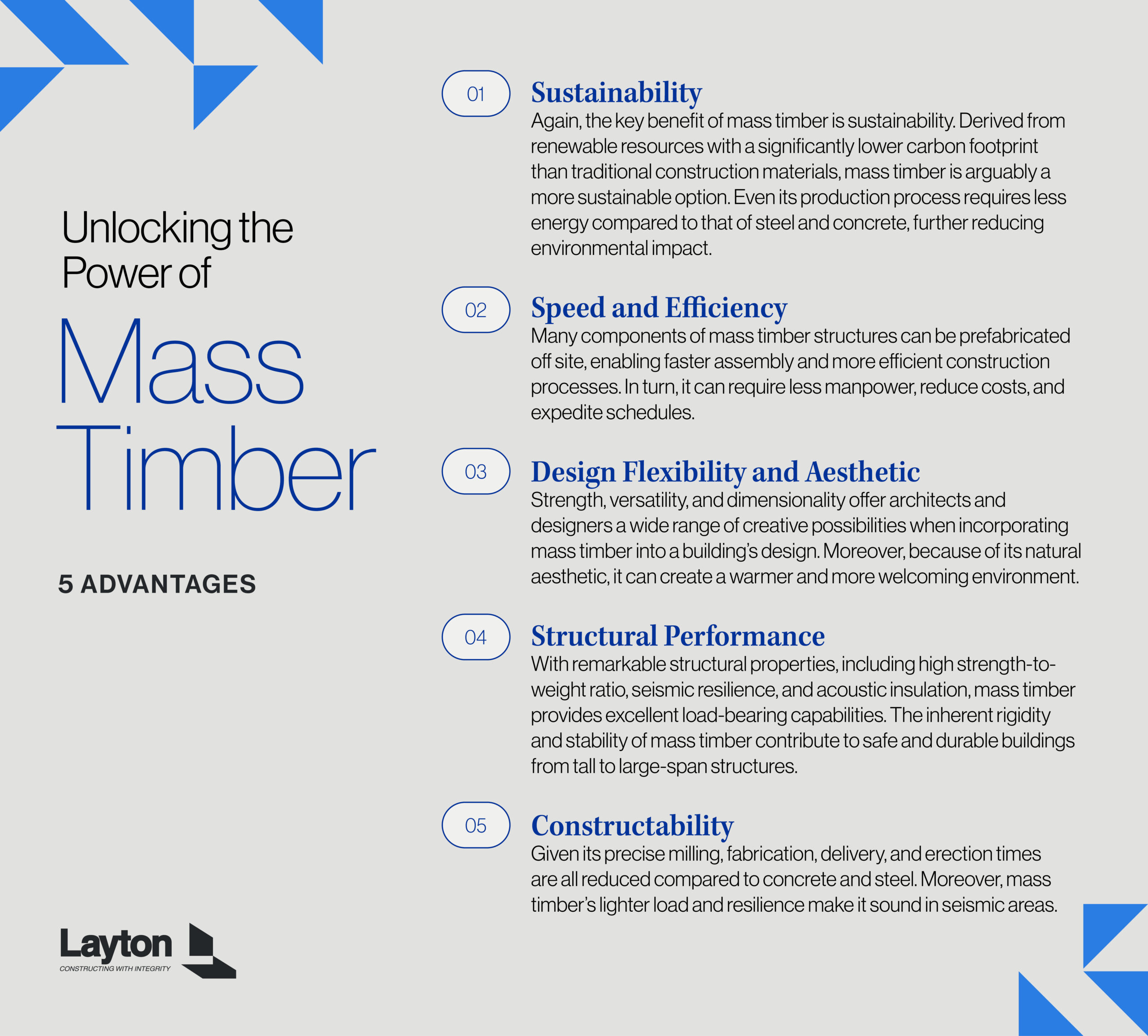 In any case, client interest in mass timber continues to increase, and Layton is well equipped to speak first-hand of the benefits and critical construction considerations. By understanding the various types of mass timber and addressing associated risks—while harnessing the value it surely offers—we can embrace the innovative material as it paves the way for a greener and more resilient future.